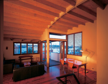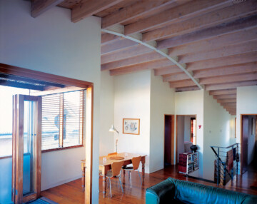 Detailing is direct and deliberately raw. The arc of the roof, supported by curved steel beams encloses a timber-lined open-plan living space.