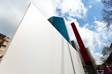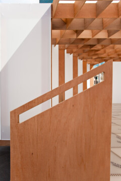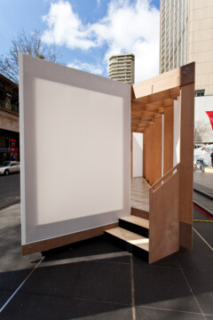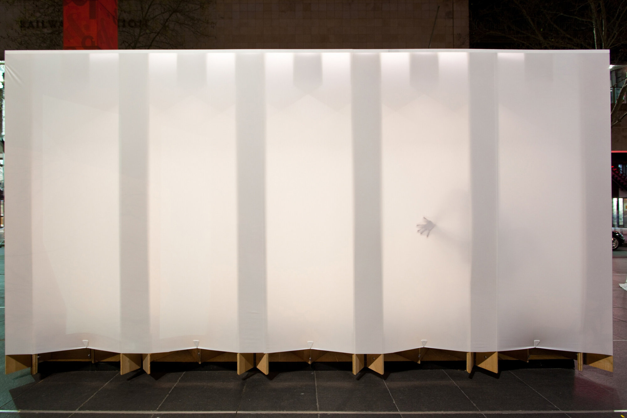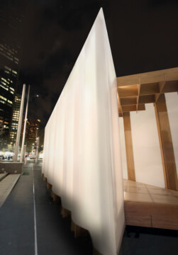 The interlocking timber plank design allowed for a quick and clean construction process. A partially transparent membrane was stretched over the structure, giving the Shelter a distinct lightness.