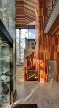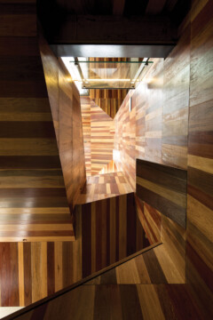 The new Stair Hall is simply detailed in steel and glass, concrete and timber. An applied pattern on the glazing provides privacy for the adjoining house. Recalling the patterned pine and cedar and angled arrangement of the original ceilings, several species of plantation hardwood were used in the new timberwork.