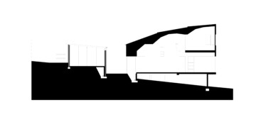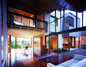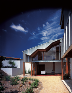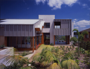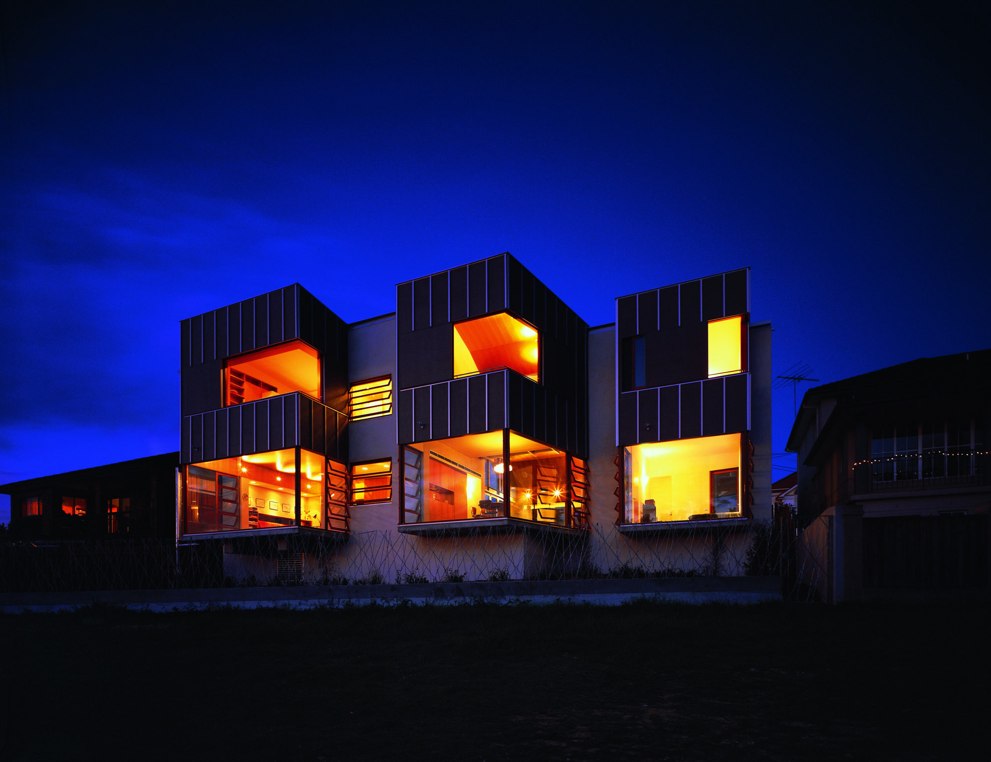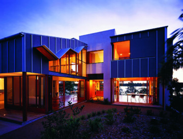 The external walls are grey-stained ply, jointed with aluminium T sections. Windows and solid shutters slide across the face of the walls to leave the openings free of framing.